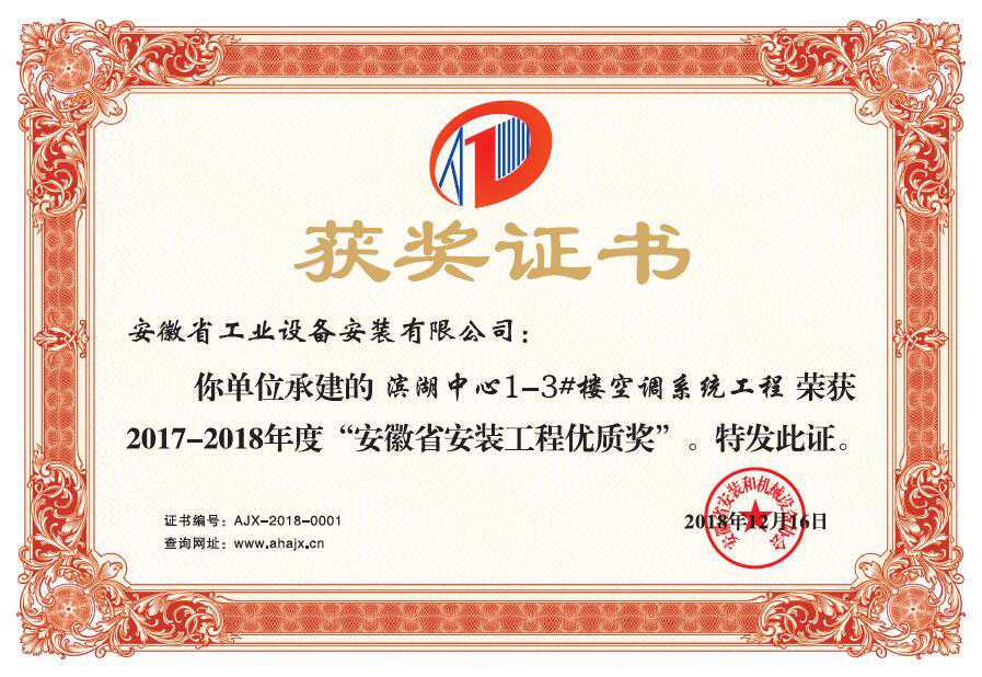根據《中國安裝工程優質獎(中國安裝之星)評選辦法》(安協〔2015〕19號)、《關于開展“2017-2018 年度中國安裝工程優質獎(中國安裝之星)第一批評選活動”的通知》(安協〔2017〕7 號)要求,協會做為我省推薦單位,組織專家對七個申報中國安裝工程優質獎項目,進行檢查驗收,一致認為,均代表我省安裝行業優質水平。為表彰先進,樹立標桿,經研究決定授予安徽省工業設備安裝有限公司“濱湖中心1-3#樓空調系統工程”等七項工程榮獲2017-2018年度“安徽省安裝工程優質獎”。并在協會第七屆三次理事(擴大)會議上通報表彰。協會希望各獲獎單位珍惜榮譽,再接再厲,繼續探索爭先創優的經驗,充分發揮示范引領作用,各協會會員單位要以獲獎單位為榜樣,牢固樹立質量第一意識,多出精品,多創名品,為質量強省,提質優效,轉型升級發展而努力。