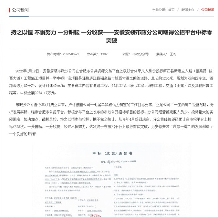 開拓市場取得突破。今年以來,分公司積極采取參與集團內(nèi)部產(chǎn)業(yè)鏈專業(yè)分包競標和外部公招項目投標雙向并舉的方式拓展市場,打開經(jīng)營局面,連續(xù)承接了蜀山區(qū)體育公園項目安裝工程等多個項目。同時積極參與合肥市公招平臺投標,8月份一舉中標廬江縣新建立人路(福泉路-城西大道)工程施工項目,中標金額3274.17萬元,取得公招投標零的突破。