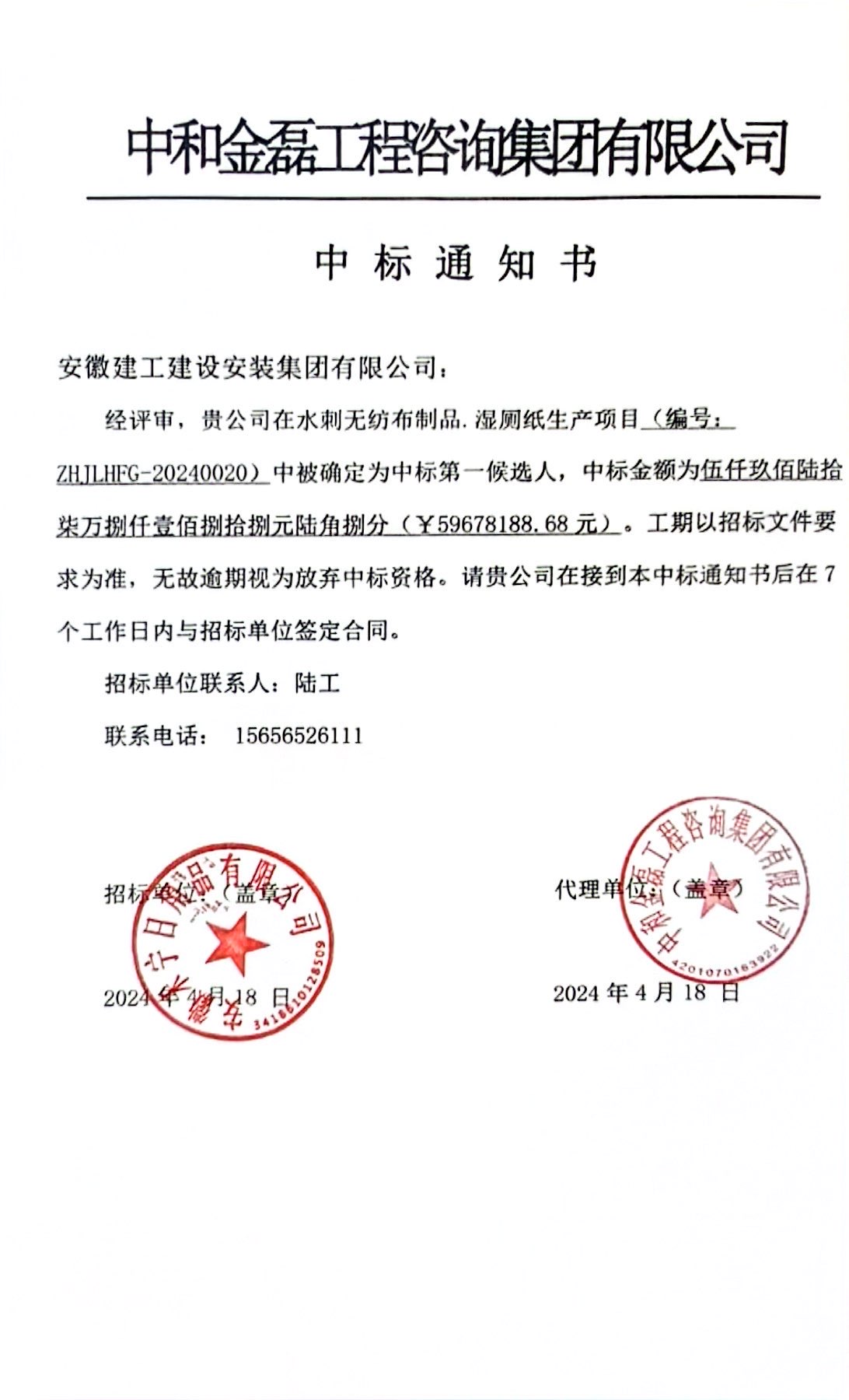 再傳喜訊!建工安裝蚌埠分公司中標(biāo)安徽禾寧日用品有限公司水刺無紡布制品廠房建設(shè)項(xiàng)目,合計(jì)中標(biāo)金額5968萬元。