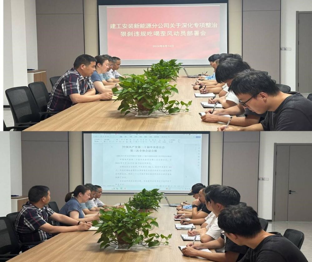 8月14日下午,建工安裝新能源分公司召開專題會議,對宣貫深化專項整治狠剎違規吃喝歪風工作進行了動員部署,會議由黨支部書記劉紅艷主持。