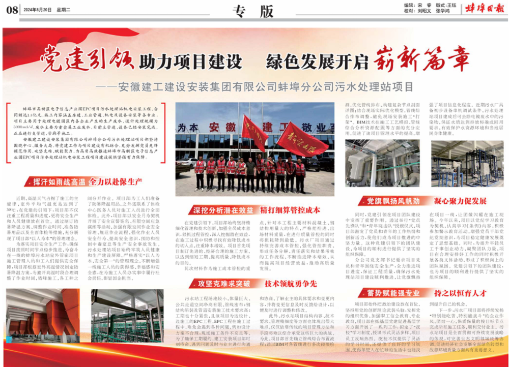 媒體聚焦丨蚌埠日報專版報道安徽建工建設安裝集團有限公司蚌埠分公司污水處理站項目 ——黨建引領助力項目建設 綠色發展開啟嶄新篇章