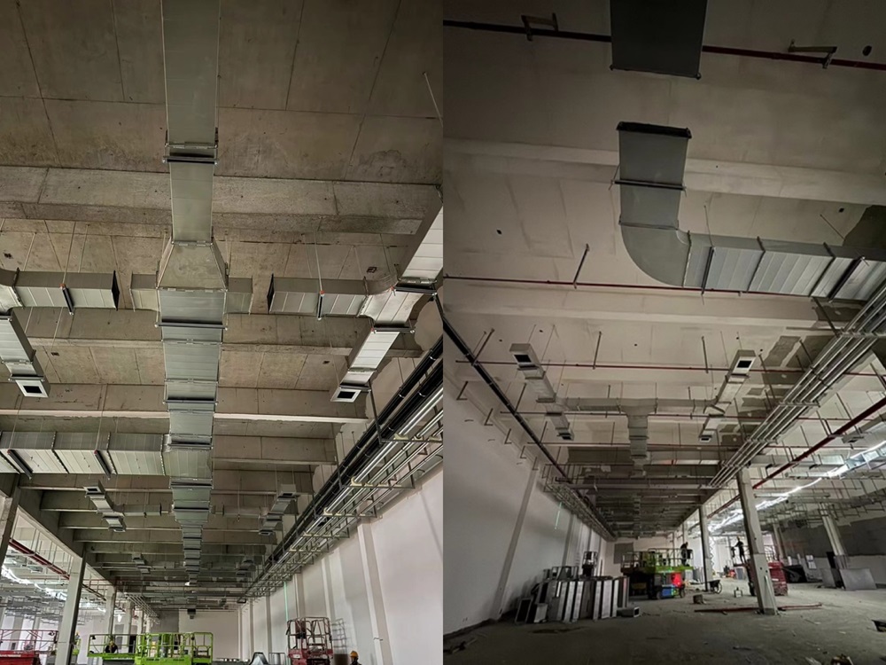 目前,焊裝車間循環水系統、消火栓系統、給排水系統、壓縮空氣已完成全部管道安裝任務,進入吹掃試驗階段。電氣系統進入電纜放線和柜體箱體安裝階段,暖通系統進入屋頂閣樓安裝階段。