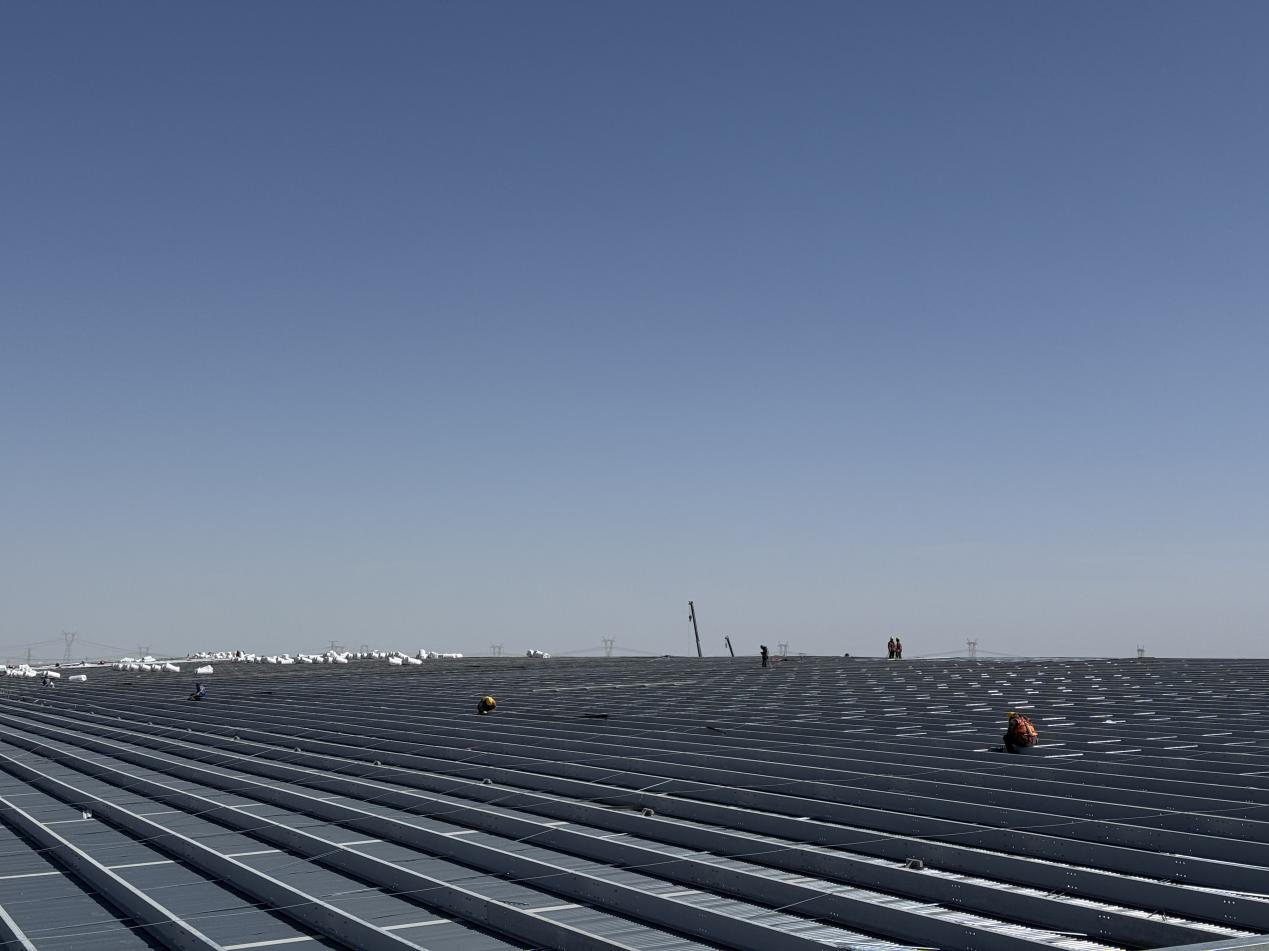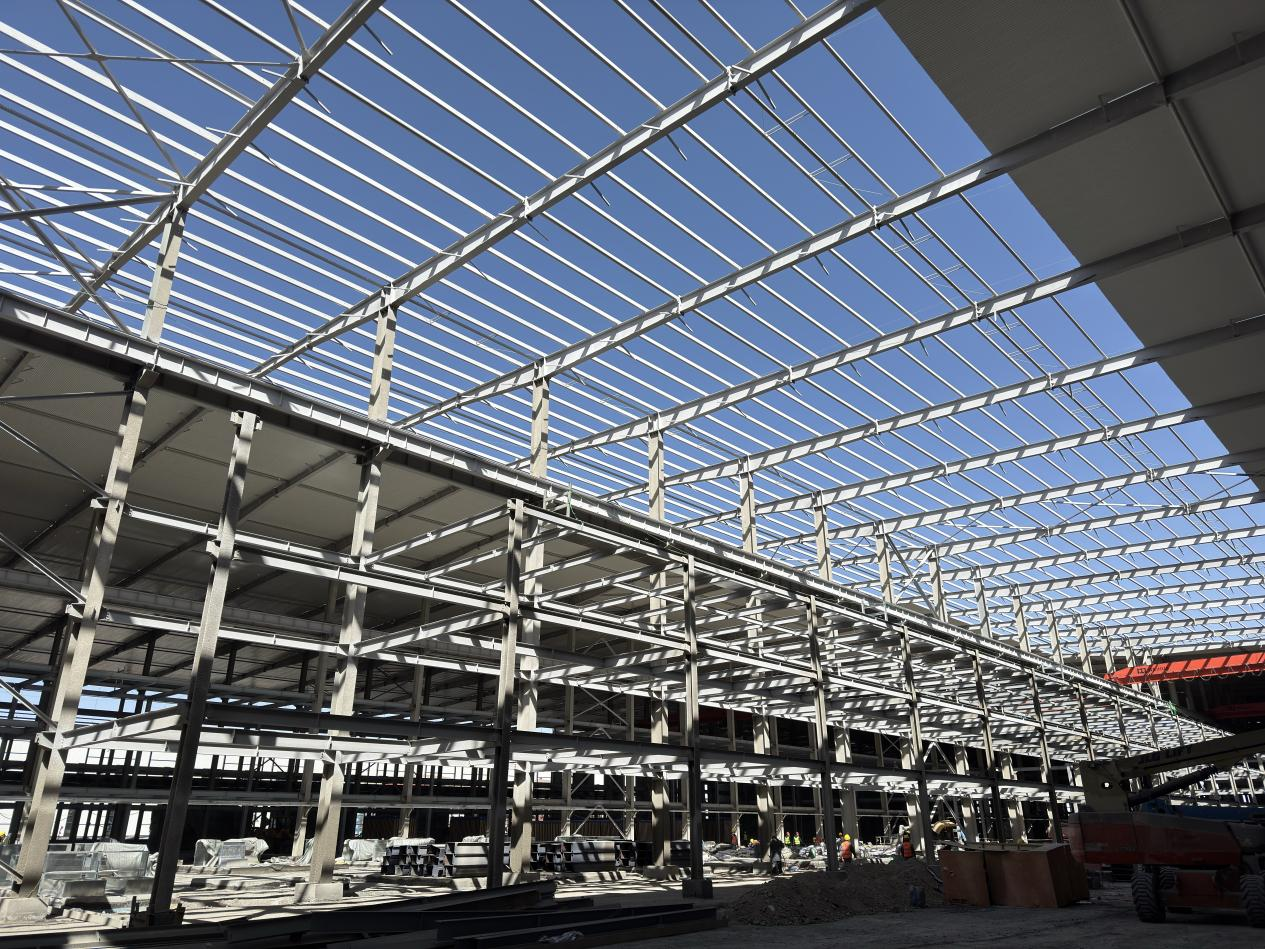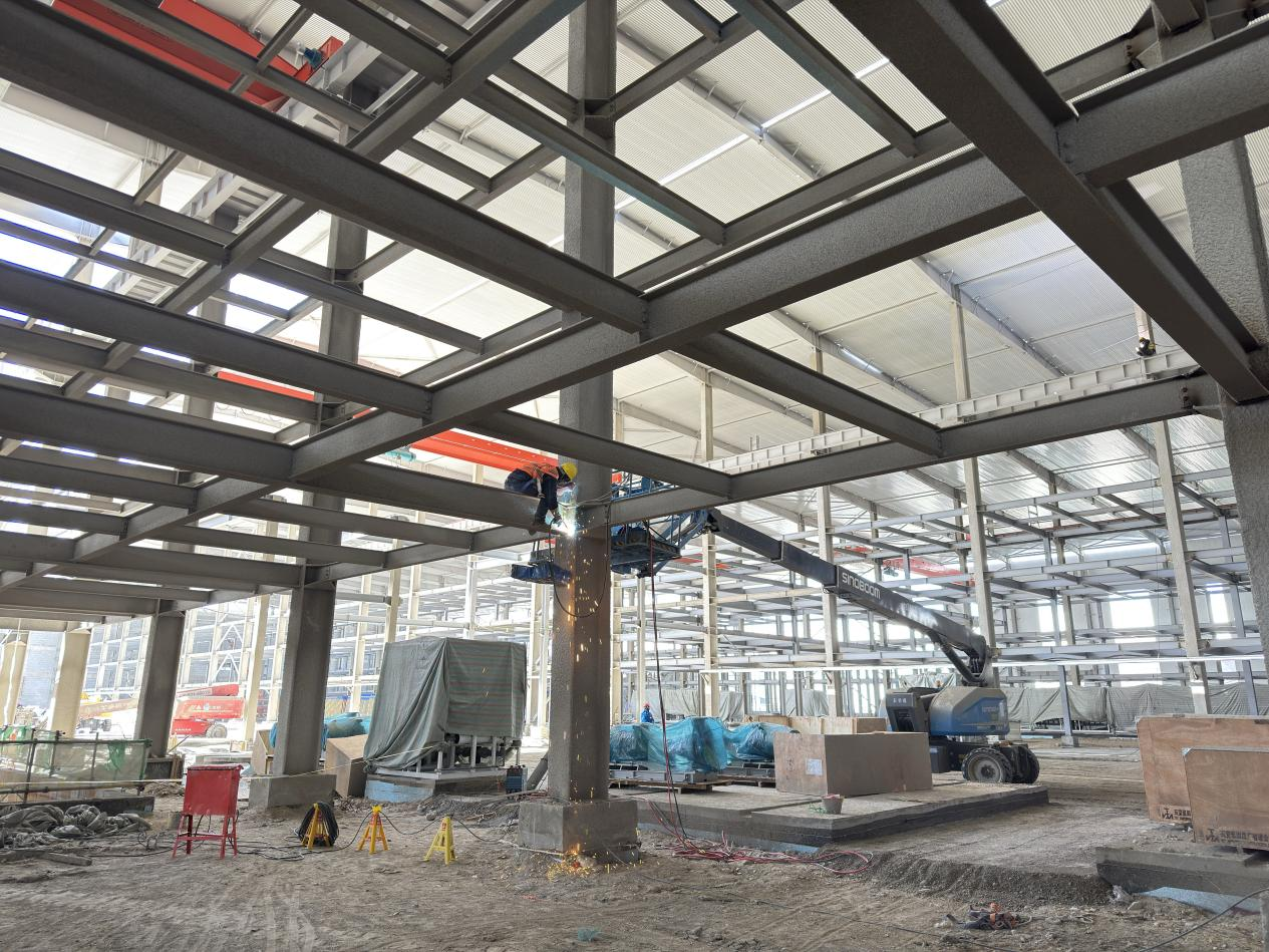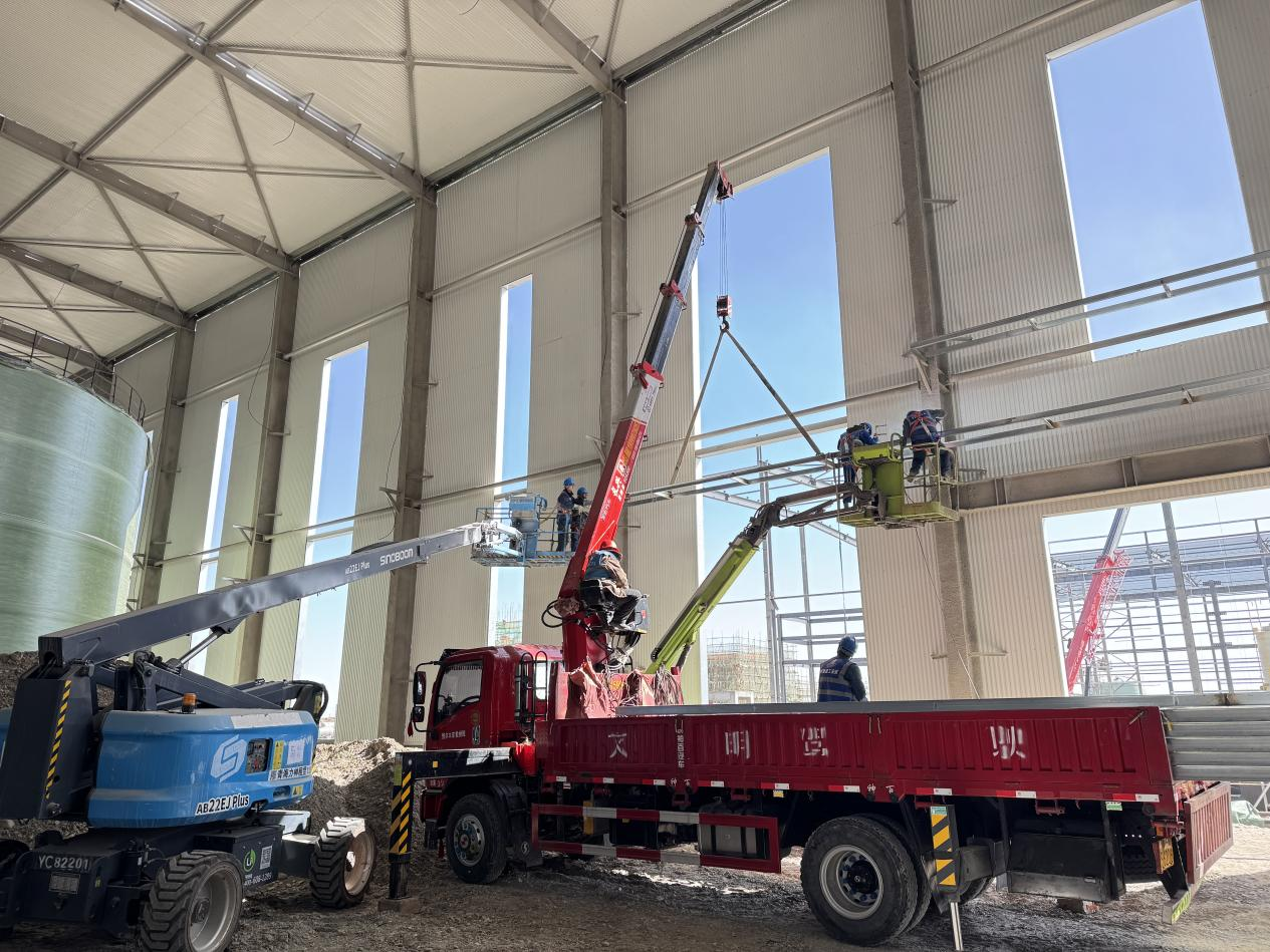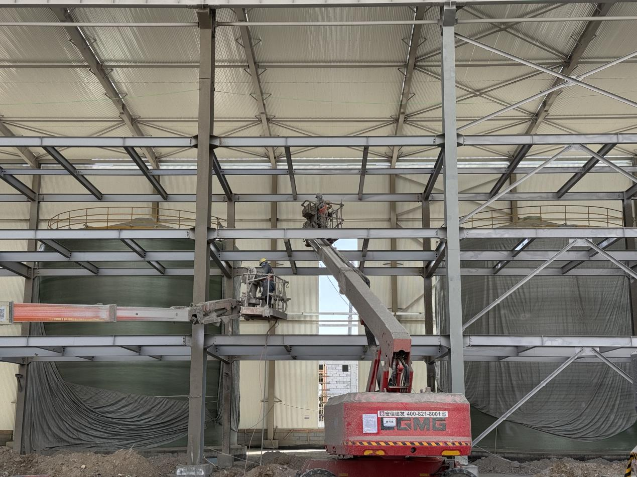 項目地處高海拔鹽湖區(qū),缺氧且淡水匱乏,施工環(huán)境惡劣,資源保障困難。面對不利因素,項目團隊迎難而上,積極尋找解決方案,為項目順利推進筑牢基礎。截至目前,項目已取得顯著階段性成果,廠房主鋼構(gòu)全部完成,管廊鋼結(jié)構(gòu)完成約95%,防火涂料完成80%,屋面及墻面圍護結(jié)構(gòu)完成約50%,配電房裝飾裝修工作有序進行,各項任務按計劃穩(wěn)步推進。
